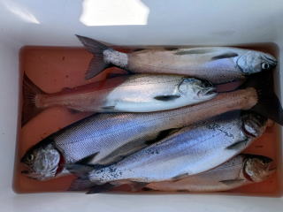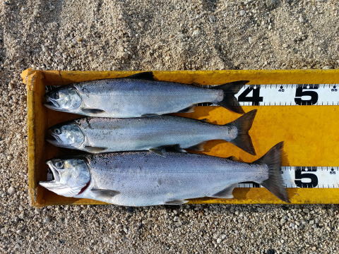 Kさんに聞くと、ダウンリガーで20メーターレンジを引いて、41と34pが釣れたそうです。
