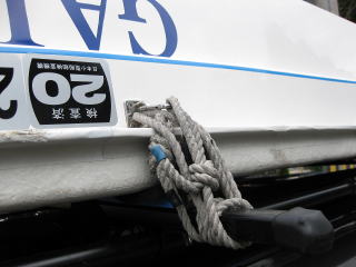予備のロープで前のキャリアバー2本とバウカバーのクリートを結んでいます。