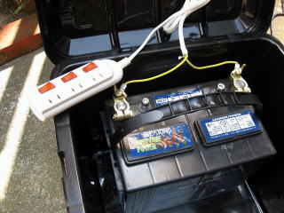 下はバッテリーの画像です。シーキングの90Aに独立スイッチの3つ口コンセントを接続しています。