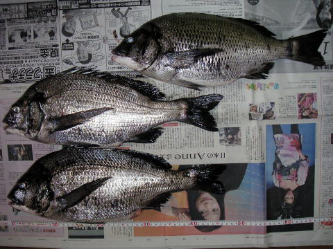 底に向かってゴンゴンと小気味よい引きで上がってきたのは、43pのチヌでした^^