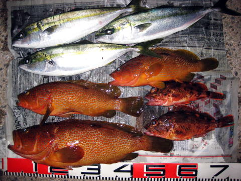 アコウ52センチまで3匹、 ガシラ2匹、 45センチ級のツバス数十本
