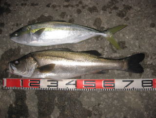 シーバス : 77cm (バンズ) メジロ : 65cmくらい (カリボソジグ120グラム)