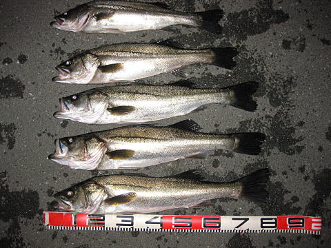シーバス : 70cm前後5本 フィード ザブラシステムミノーシャロー