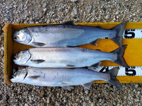 Kさんに聞くと、ダウンリガーで20メーターレンジを引いて、41と34pが釣れたそうです。