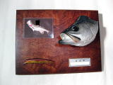 1枚のボードにシーバスの頭、記念プレート、釣りあげたルアー、写真など